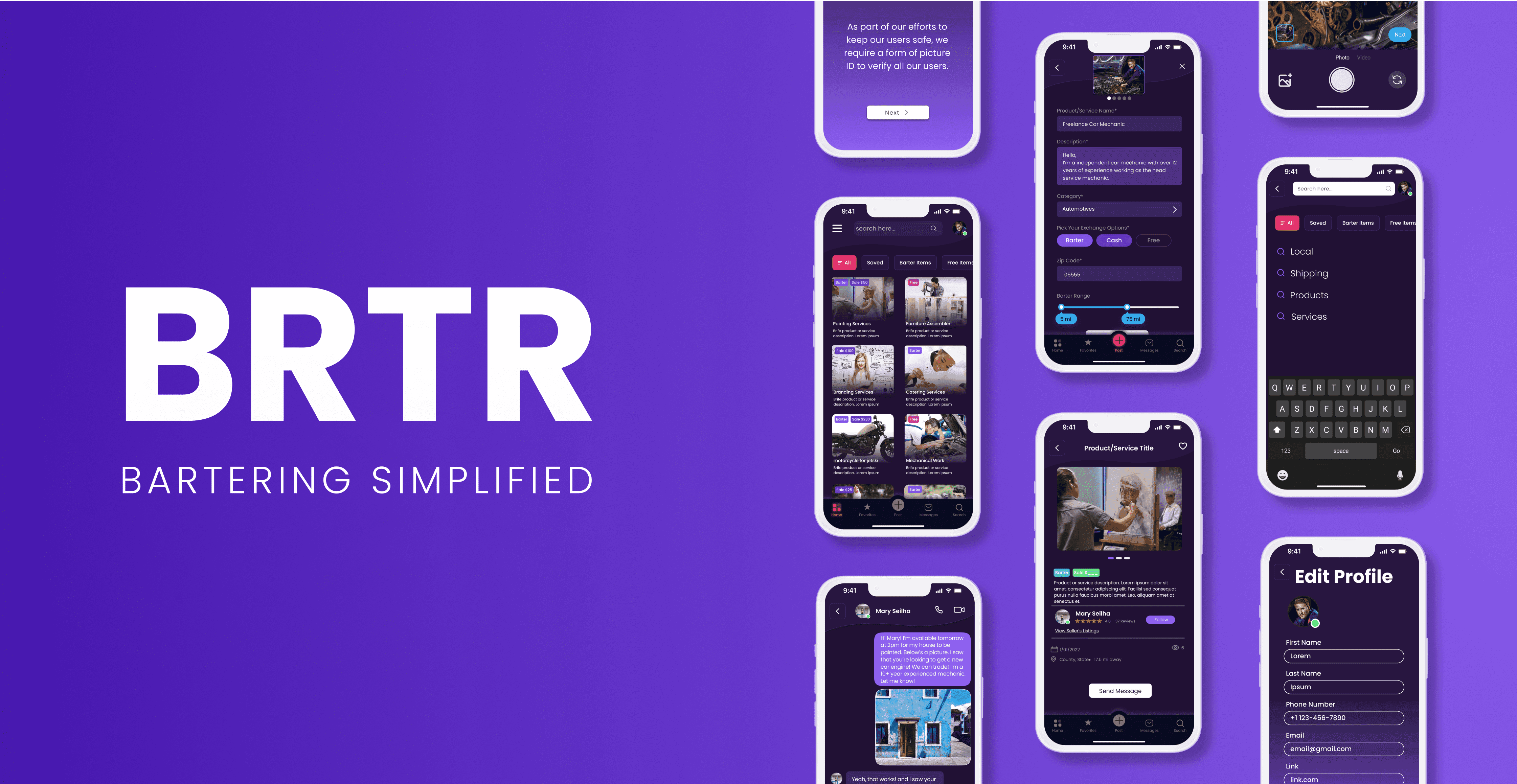 Information Architecture: BRTR, the app is structured similarly to Facebook Marketplace but focuses on services rather than goods. Users can browse or post service listings based on their needs, offering their own skills in return as part of the bartering process. The app’s wireframe includes key features like user profiles, service categories, messaging, and transaction histories. Navigation flows emphasize ease of use, allowing users to quickly find relevant services, initiate exchanges, and verify credibility through ratings, reviews, and ID verification.