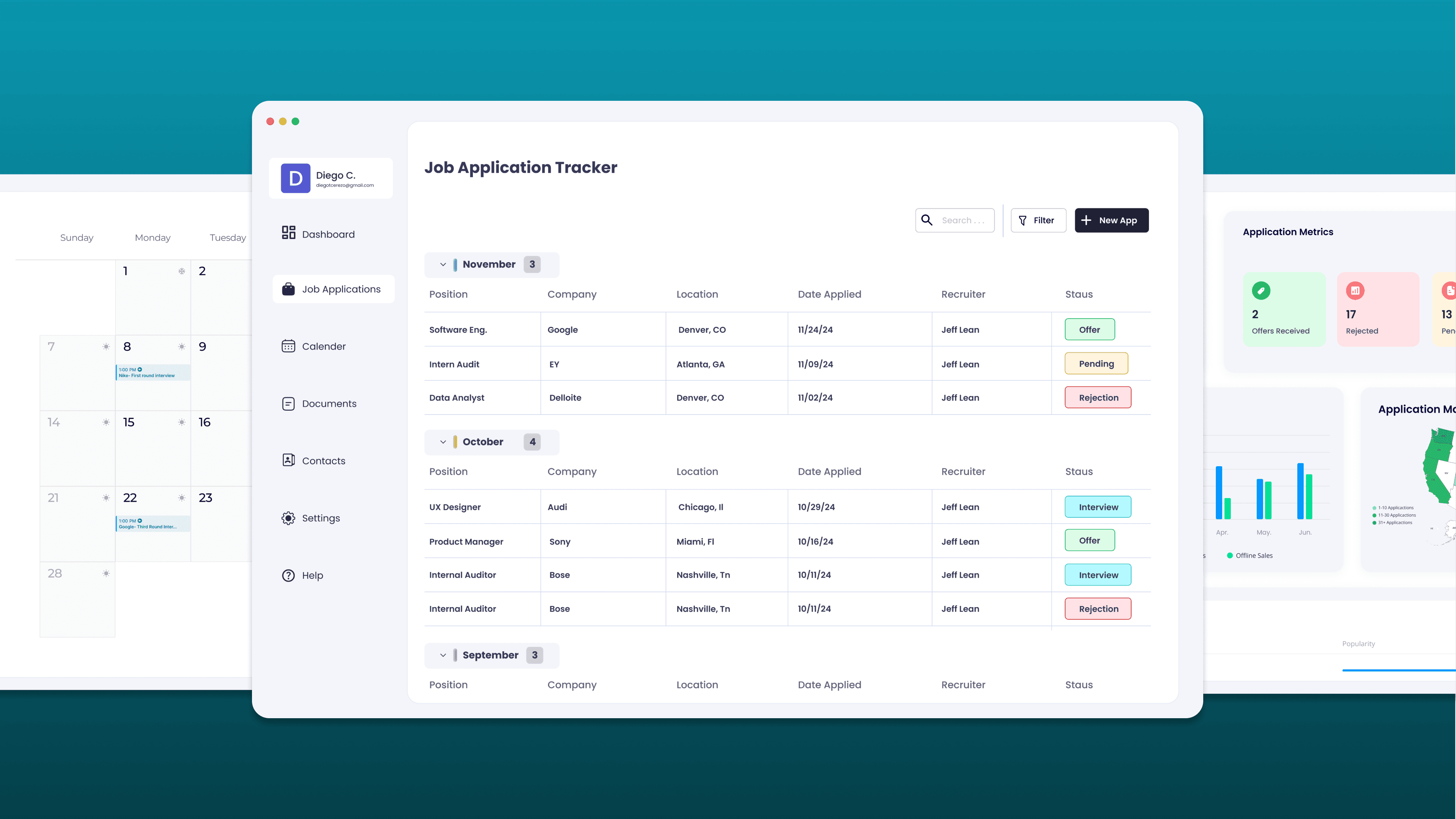 Hireflow is a solution designed to streamline the job search process. It features a comprehensive application tab where users can meticulously record details like application dates, locations, recruiter contacts, and current status. An intuitive dashboard provides a visual overview of job search progress, including total applications, monthly application trends, a US heat map of company locations, industry breakdowns, and a clear visualization of application statuses. Furthermore, a dedicated documents tab allows users to efficiently manage essential job-related materials such as resumes, cover letters, portfolios, and certifications. Finally, a visual calendar tab enables users to effectively schedule and organize interviews.